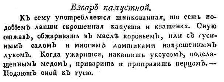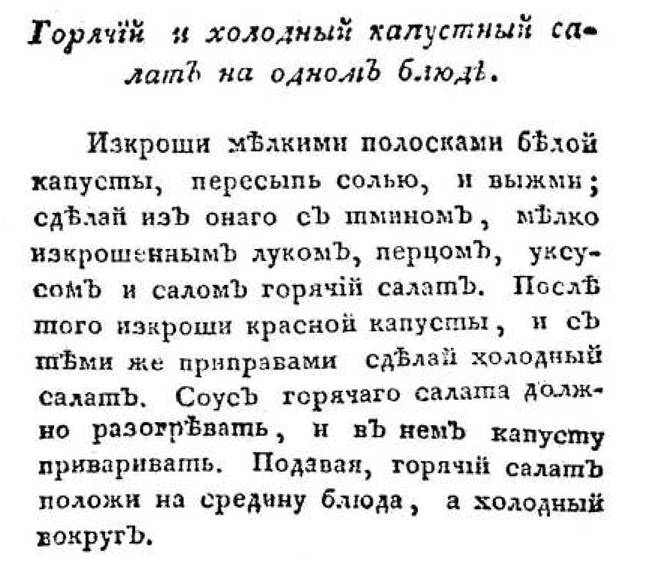 А дальше с приходом в нашу кухню европейских блюд в конце XVIII века капуста и вовсе становится незаменимой для салатов и супов. При этом трудно сказать, насколько, скажем, такой рецепт был распространен в реальной кухне этого времени. Или это было лишь творчество и пожелание составителя «Поваренного календаря», пытавшегося с помощью незатейливых переводов привить вкус к иностранным блюдам. В разных областях знания мы сталкивались с подобными процессами. Когда по-европейски ориентированная литература эпохи старалась познакомить публику с новыми привычками, вкусами, вещами. Только не всегда эти стремления авторов превращались в реальный общественный интерес, оставаясь порой лишь любопытной приметой времени, странной на сегодняшний взгляд комбинацией «французского с нижегородским»44: