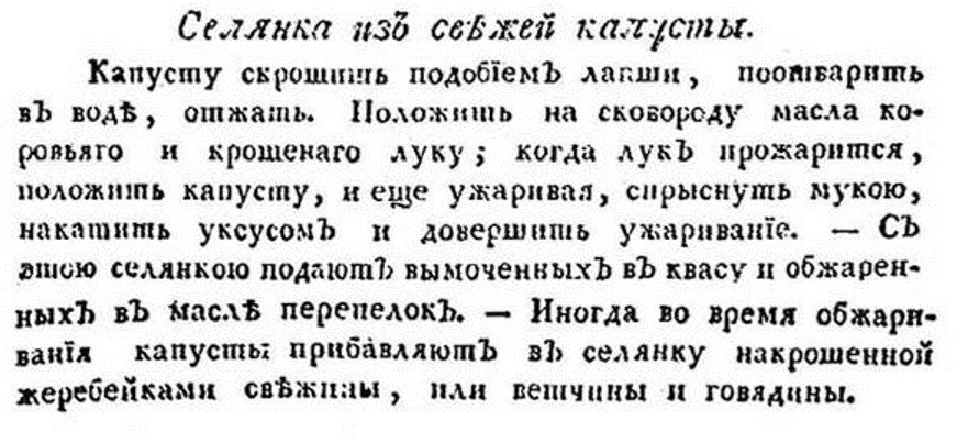 Другое, несомненно, историческое русское блюдо – селянка. Тут, как всегда, возникает путаница: селянка-солянка. Что из них суп, а что – жареная капуста? Скажем откровенно, изучение старинных источников ясности в этом вопросе не прибавляет – в разных книгах может обозначать и то и другое. Что, в общем, вполне объяснимо – поджаренная капуста является основой и для горячего, и для супа43.