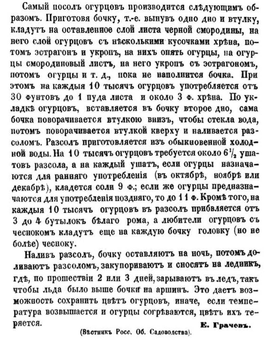 Классик российского огородничества селекционер Ефим Андреевич Грачев (1826–1877), отдав много времени работе с муромскими огурцами, давал и свой рецепт58 их засолки: