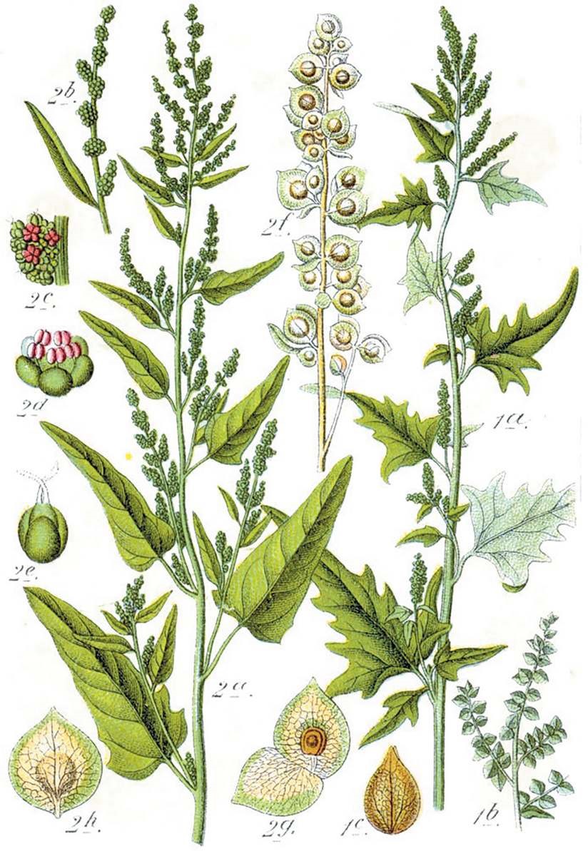 Лебеда садовая (Atriplex hortensis), справа – лебеда стреловидная (Atriplex sagittata). Ботаническая иллюстрация Якоба Штурма из книги «Deutschlands Flora in Abbildungen», 1796