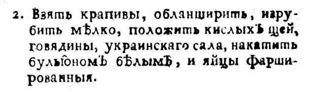 Травы сии следуют весною одна по другой, и когда первая устареет, поступает в употребление другая, пока дойдет до свежей капусты и свекольных листов. Варение оных производится одинаким образом, например: взять молодой крапивы, пообварить в кипятке (разумеется, перебравши и ополоснув), отдать и изрубить очень дробно. Между тем варить в воде говядину или баранину кусками, с прибавкою нескольких кусков ветчины. В половине варения положить крапиву количеством столько, чтобы сделалось густовато. Для лучшего можно крапиву пообжарить в масле и спрыснуть мукою. Когда поспеет, положить во щи яиц, сваренных в густую, облупив и каждое разрезав пополам. Подавать, забелив сметаною»71.