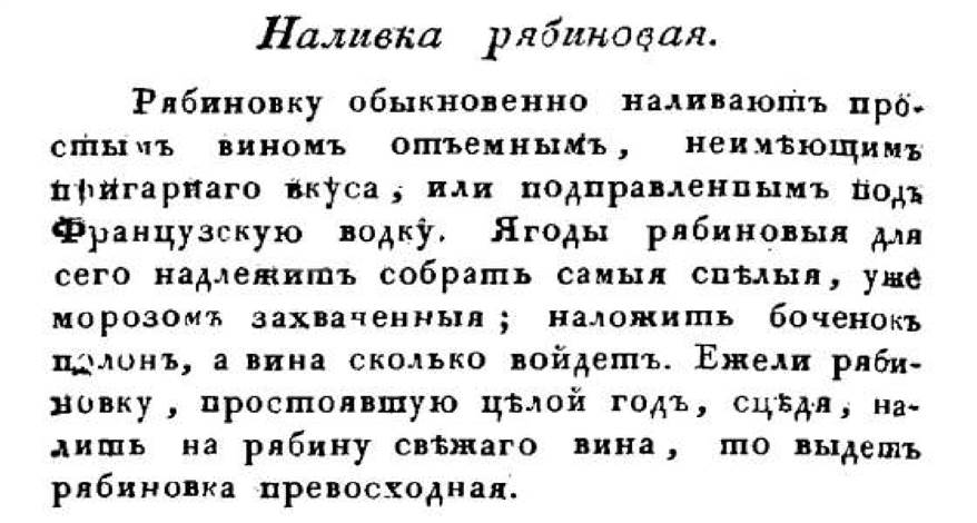 Или читаем в той же книге: «Иным образом делаемая рябиновка. Наполнить бочонок рябиновыми ягодами, и взогрев патоки, горячую влить в бочонок на ягоды и прибавить, соображаясь величины бочонка, стакан или больше французской водки: чрез три месяца получишь рябиновку».