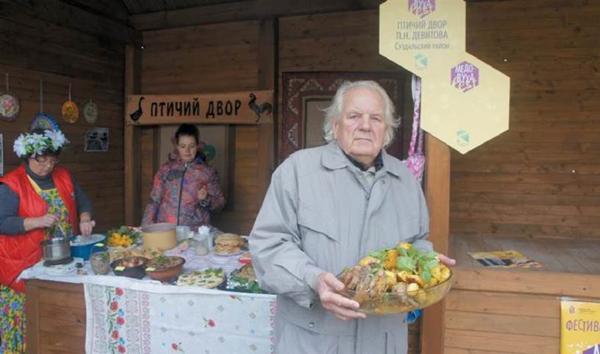 Не правда ли, очень яркие картинки? Остановимся подробнее на грибах. Обязательным блюдом суздальского праздничного стола была грибная икра. Собирали подберезовики, подосиновики, белые. Их в основном сушили в печке на проволочках. Хранили потом в стеклянных банках. А на праздник эти сушеные грибы доставали, замачивали, отваривали в соленой воде, мелко рубили или прокручивали через мясорубку. Затем добавляли мелко порезанный свежий лук – тогда получалось поострее. Либо использовали чуть-чуть обжаренный – кто как любит. Пахучее подсолнечное масло дополняло этот вкус. Как вы понимаете, эта грибная икра была достаточно дорогим удовольствием. Местные жители рассказывали нам, как в 1960-е годы ее укладывали в половинки вареных яиц вместо желтка (как настоящую черную или красную икру) и так подавали на праздничный стол.