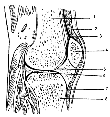 Рис. 1. Строение сустава: 1,8 – кость, 2 – суставная капсула, 3 – суставная полость, 4 – надколенник, 5 – суставная жидкость, 6 – медиальный диск, 7 – связка