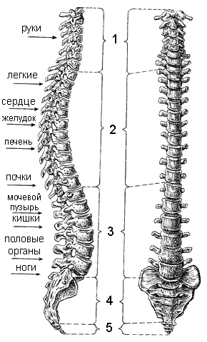 Рис. 3. Строение позвоночного столба: 1 – шейный отдел, 2 – грудной отдел, 3 – поясничный отдел, 4 – крестцовый отдел, 5 – копчиковый отдел