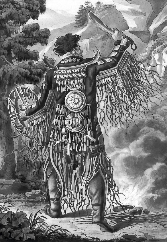 Одно из самых ранних и при этом очень точное изображение эвенкийского шамана, сделанное с натуры художником Емельяном Корнеевым для книги «Народы России, или Описание обычаев, нравов и костюмов разных народов Российской империи», вышедшей в Париже в 1812 году