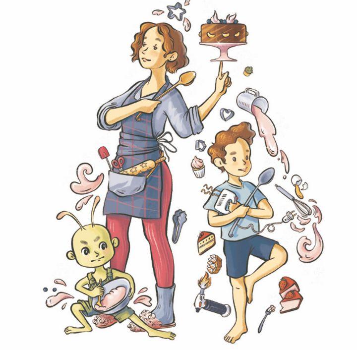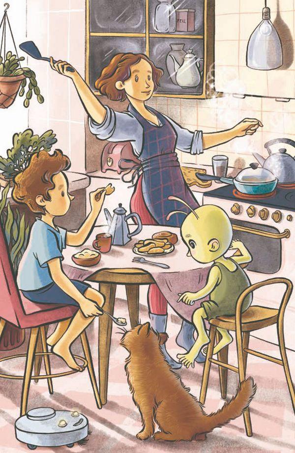 Он оглянулся на маму и папу – они сидели, как обычно уткнувшись в свои телефоны, и совсем не смотрели в их сторону. Тогда Коля схватил маленького инопланетянина за руку и потащил его к двери. Они прошмыгнули внутрь и попали туда, откуда появлялись Очень Вкусные Торты, – на кухню.