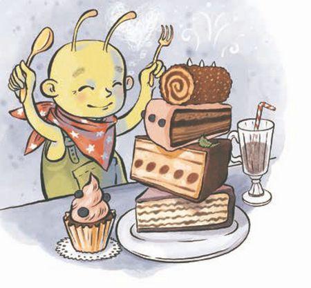 Родители еле уговорили его сесть за столик. Коле мама разрешила выбрать три вида торта, а Масиандру – целых пять. Маленький инопланетянин сразу принялся уплетать свою порцию. Коля только вздохнул, посмотрев на его тарелку. Масиандр даже на секундочку остановился, услышав этот вздох, но только на секундочку.
