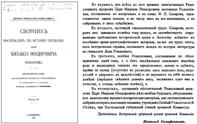 В конце XIX в., 12 июля 1896 года состоялись празднования 300-летия со дня рождения царя Михаила Фёдоровича. На основании Высочайше утверждённого 15 февраля 1897 года положения Кабинета министров, при Костромской архивной комиссии, председателем которой являлся член Государственного Совета Н.Н. Селифонтов, был образован Особый Романовский Отдел архива и библиотеки, с неограниченными полномочиями. В задачи его входило собрание и хранение сведений о предках первого Царя из Дома Романовых. Во вступительном слове итогового труда комиссии, «Сборника материалов по истории предков царя Михаила Фёдоровича Романова. Ч. 2. СПб., 1898», председатель Н.Н. Селифонтов обращал внимание современников и будущих поколений далёких последователей на невозможность успешного изучения генеалогии рода Захарьиных-Кошкиных в отрыве от ряда пока не изученных сфер, в том числе и их землевладений.