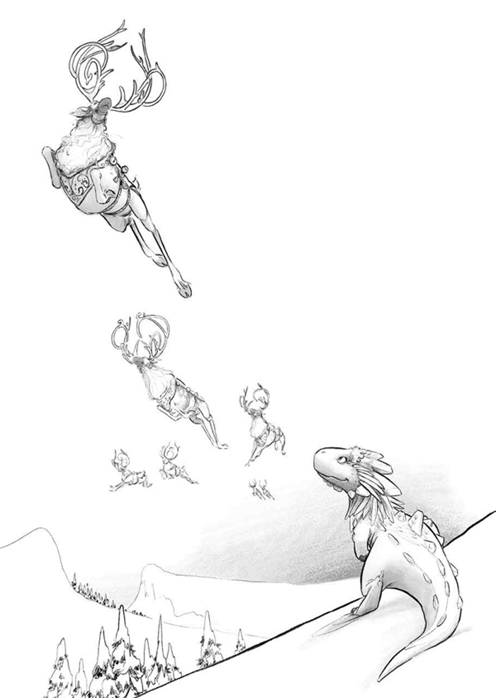 «Если уж олени умеют летать, то и я смогу!» – рассуждал наш динозавр про себя, если динозавры вообще могут рассуждать. Он поклялся, что не пожалеет никаких усилий, лишь бы оторвать свой чешуйчатый хвост от земли и воспарить под облаками в оленьей упряжке!