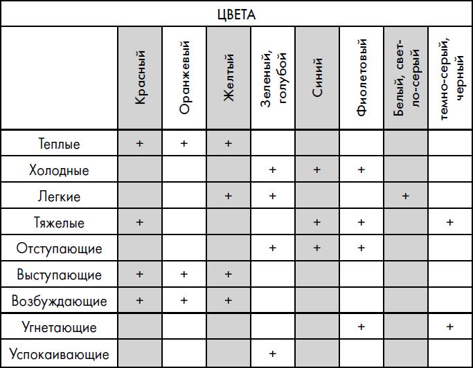 Говоря о влиянии цвета, следует подчеркнуть, что сила его воздействия зависит от настроения, характера, восприимчивости человека и от целого ряда других факторов. Для иллюстрации можно привести таблицу, которая дает общее представление о сложном характере воздействия цвета на человека.