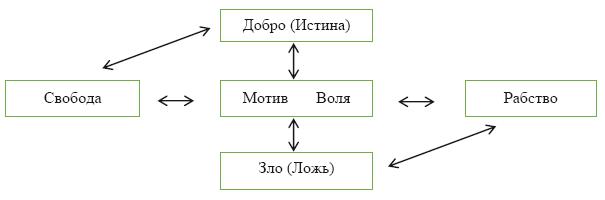 * * *Вернемся к преодолению раскола внутри индивидуального «Я». В деле восстановления единства «Я», ключевое значение имеет диалектика мотива и воли, проявляющаяся через полярность Свободы и Рабства, Добра (Истины) и Зла (Лжи).