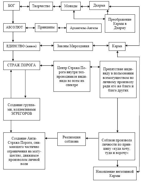 Пояснение 4. Ориентация на Анти-Стажа Порога, маскируемая ориентацией на Анти-Бога, реализуется при помощи магических действий, ритуалов и т. п., с активизацией усилий личной воли, с применением разного рода вампиризма жизненного магнетизма, в особенности через жертвоприношения. В результате Анти-Страж Порога (Фантом Дьявола, Сатаны и т. п.) временно и частично нейтрализует сдерживающее влияние Стража Порога. Слуги Черного Конуса Тьмы, разного рода черные маги получают временную возможность творить в Мироздании произвол своей личности, являются всегда рабами своих страстей. При этом строится та или иная жизненномагнетическая пирамида Зла. Пока она растет, возвратные удары Кармы сдерживаются. Но всякая пирамида, сколь бы ни была она мощной и масштабной, рано или поздно разваливается в виде цепной реакции распада. Тогда за содеянное зло приходится расплачиваться с процентами.