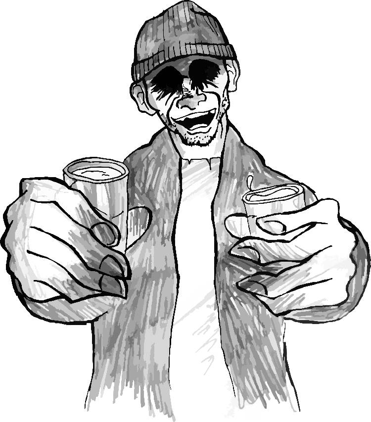 Пьяница выплеснул жидкость из стопок на снег, и она тут же испарилась, обратившись режущим глаза дымом. Затем он, осклабившись, расшаркался, прошмыгнул в щель между людьми и исчез в одном из подъездов.
