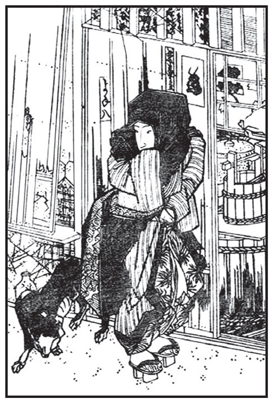 Как она выглядит? На ней одежда в серую полоску из плотного шелка-уэда, а пояс двусторонний, как окрас кита: с исподу жатый креп, а налицо черный с фиолетовым шелк «ивушка». Нижние одежды темно-синего атласа с некрупным узором. В руках она держит накидку с капюшоном. Высокая прическа-симада растрепана, красивое лицо без грима. То ли она и так довольна своей наружностью, то ли пришла по-утреннему неприбранной. Лицо ясное, как цветок, но глаза печальны. Молодой человек с удивлением всматривается в ее черты.