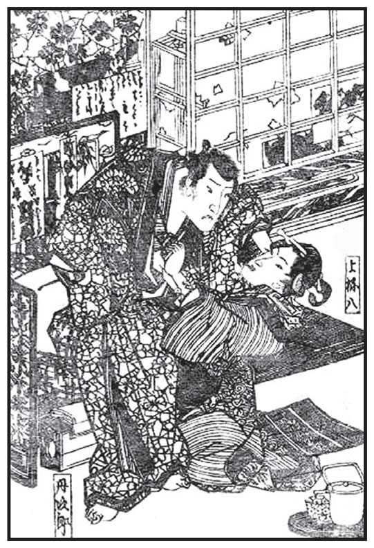Ёнэхати. По правде говоря, с утра я пошла помолиться в храм Мёкэн-сама. И вот удивительная встреча. Вы – и в таком месте! Мне и во сне бы не привиделось искать вас здесь, если бы не одна девушка, новенькая, ее взяли к нам недавно. Наши, как водится, спросили, откуда она родом, и оказалось, что из Хондзё. От нечего делать завели разговор, и она рассказала обо всех своих соседях. Один из них чем-то напомнил мне вас… А может, это только показалось? На ночь я положила ее спать у себя и расспросила как следует. Она сказала, что в доме вашем есть и хозяйка, красивая да ладная, и я было усомнилась, однако стала еще дотошнее задавать вопросы. Оказалось, что хозяйка вроде бы старше хозяина и обыкновенно дома ее не бывает. Чем больше я слушала, тем больше убеждалась, что речь может идти о вас. Но все же я не могла быть уверена до конца и наказала девушке помалкивать о моих расспросах. Я надеялась во всем удостовериться, когда пойду на богомолье. Можете себе представить, с каким нетерпением я ждала сегодняшнего дня – пятнадцатого числа. И вот наконец я здесь. Ведь говорят же люди: если день-деньской молиться об одном… Не иначе как сам бог Мёкэн привел меня к вашему дому. Но как я ни рада, мне не дает покоя слух, что вы женаты. Где сейчас ваша жена?