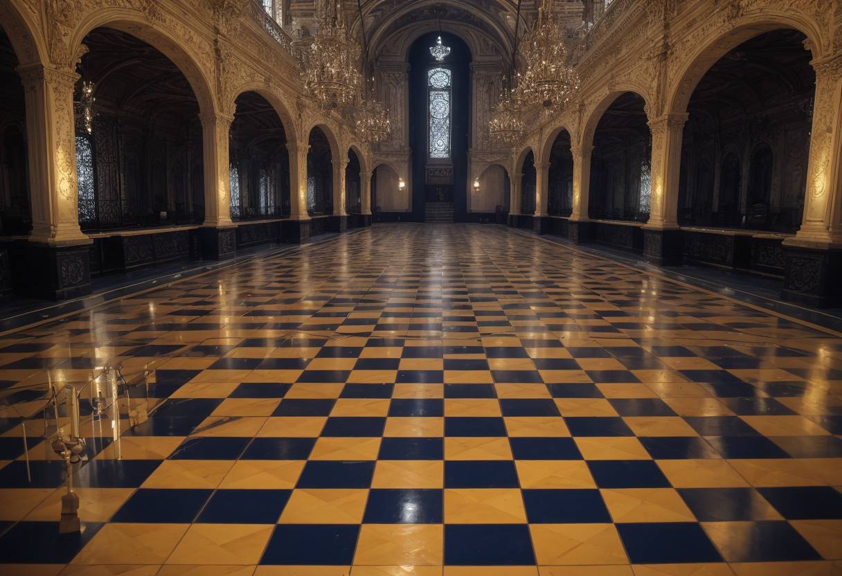 Я огляделся. Мы находились в большом зале, пол которого был расчерчен, как шахматная доска, на большие черно-белые клетки. Вернее, цвета клеток были, скорее, золотыми и темно-синими.