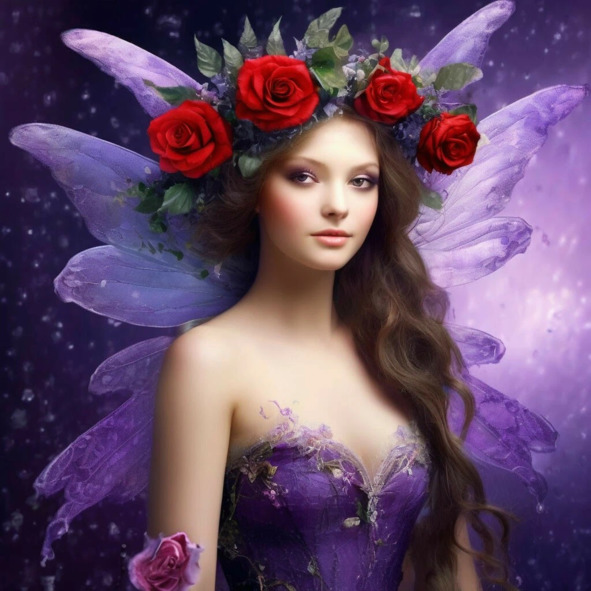 Фея зари пурпурнойВ платье ходит ажурном.Венок из красных розУкрашает копну волос.Фея зари пурпурнойС точечной прекрасной фигурой,И бусы из капель росыВплетены в её две косы.Фея зари пурпурнойНикогда не бывает понурой.Здоровым весельем полна,Задорная песня слышна.Фея зари пурпурнойВ делах помогает амурных.Ведь розы- любви цветы,Исполняют влюбленных мечты.И дружат с феей пурпурной,Нежной и миниатюрной,Эльфы волшебных цветовИз параллельных миров.