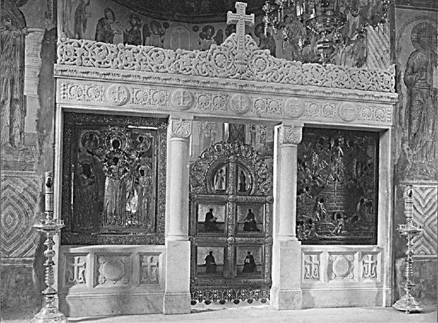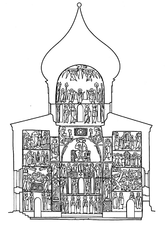 В домонгольской Руси высокого иконостаса, как в Византии, не существовало – была только алтарная преграда с несколькими иконами в ней. Таким образом объем храма казался больше, алтарь был виден полностью с хор храма (как в Спасо-Преображенском соборе Переславля-Залесского) и роспись алтаря была образно и символически связана с росписью остальной части храма. Постепенно начинает складываться иконостас, и, наконец, в XVI столетии он приобретает современные пять рядов и полностью отгораживает алтарь от средней части храма. Соответственно меняются и росписи алтаря и средней части – теперь они представляют собой группы самостоятельных композиций.
