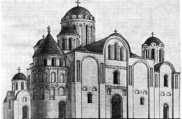 Первым каменным храмом Древней Руси принято считать Десятинную Успенскую церковь (998 г. Название было связано с десятой частью доходов, отдаваемых князьями на сооружение храма), огромную по величине и роскошную по внутреннему убранству. Десятинная церковь занимала в культуре Руси особое положение. Прежде всего это проявлялось в особенности ее функций и их комплексности. Это был княжеский храм, поскольку особого (придворного) храма в Киеве у Владимира Святославича не было. Очевидно, именно поэтому в ней были похоронены и князь Владимир, и его жена Анна. Сюда же были перенесены в 1044 г. останки князей Олега и Ярополка Святославичей, убитых во время усобицы X в., а также мощи княгини Ольги. Тут же были похоронены князь Изяслав Ярославич и его внук Ростислав Мстиславич (князей Всеволодовичей в Десятинной церкви не хоронили).