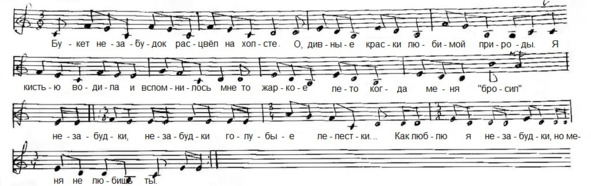 Букет незабудок расцвёл на холсте.О, дивные краски любимой природы!Я кистью водила и вспомнилось мнеТо жаркое лето, когда меня «бросил».Припев: Незабудки, незабудки Голубые лепестки… Как люблю я незабудки… Но меня не любишь ты.Ты мне подарил этот милый букетИ, глядя в глаза, прошептал очень нежно:«На долгую память прими сей приветИз нашего только, прошедшего лета».Из центра букета Анюты глазаНевинно смотрели за этим сюжетом.Вот это сюрприз… Ну и что тут сказать?Да ты и не ждал никакого ответа.Теперь они в вазе стеклянной стоят…На долгую память о чьём-то коварстве.(Но кто этот кто-то? Уж нам ли не знать…)От сладостной лжи голубое лекарство.