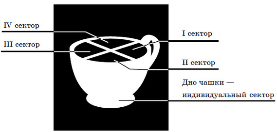 Для более конкретного гадания внутренняя поверхность чашки делится на четыре равных сектора (рис. 1):
