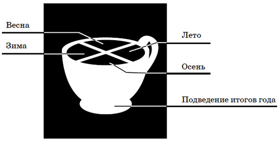 Первый сектор – возле ручки – показывает тот сезон, который есть в настоящее время (например, лето); затем смотрится слева направо по часовой стрелке – второй сектор – справа от ручки показывает события следующего сезона (осень). Третий сектор – напротив ручки – обозначает, в данном случае, сезон зимы: последний четвертый сектор по кругу слева от ручки – сезон весны. Таким образом показываются события в течение года.