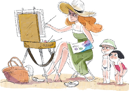 Юная художница сидела на самой дальней линии пляжа под зонтиком на длинной ножке. Её волосы развевались на ветру, выцветшее зелёное платье было испачкано краской.