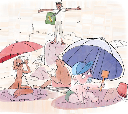 По берегу шёл смуглый мужчина в белой футболке, лёгких штанах и панаме. И только большая зелёная сумка выдавала в нём продавца. Он заглядывал под зонтики и настойчиво предлагал отдыхающим: