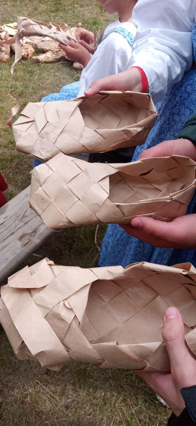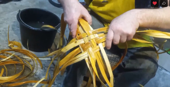 береста хрупкая, как бы мы ее не размачивали, но заготовленная она зимой, поэтому она хрупкая, но аккуратненько мы ее проплетаем целебные свойства бересты у нее сохранились.