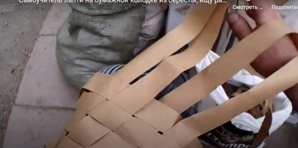 Из бумажных лаптей получаются лапти из бересты. Для этого используется колодочка по размеру заказчика. Сначала она бумажная, а потом по бумаге пробивается берестой короткой по одной лычке. В результате получаются лапти из бересты.