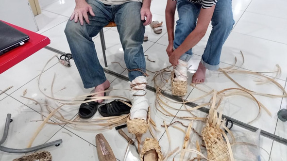 Участники используют специальные колодочки, сплетённые из восьми лычек. Они закрепляют на них по одной лычке для создания копии лаптя. Этот процесс требует внимательности и терпения, ведь каждая лычка должна быть аккуратно проплетена через другие, чтобы получилась прочная и красивая обувь.