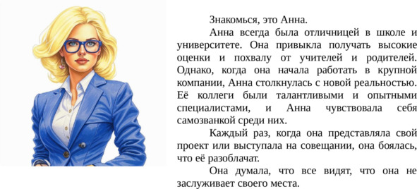 Но однажды её руководитель заметил, что Анна стала менее активной и уверенной в себе. Он поговорил с ней и понял, что она страдает от синдрома самозванца.