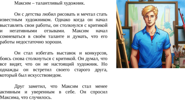 Максим начал работать над своими ошибками и улучшать свои работы. Он стал более открытым к критике и начал воспринимать её как возможность для роста. Со временем Максим почувствовал себя более уверенно. Он понял, что его талант и труд заслуживают признания. Он снова начал выставлять свои работы и получать положительные отзывы.