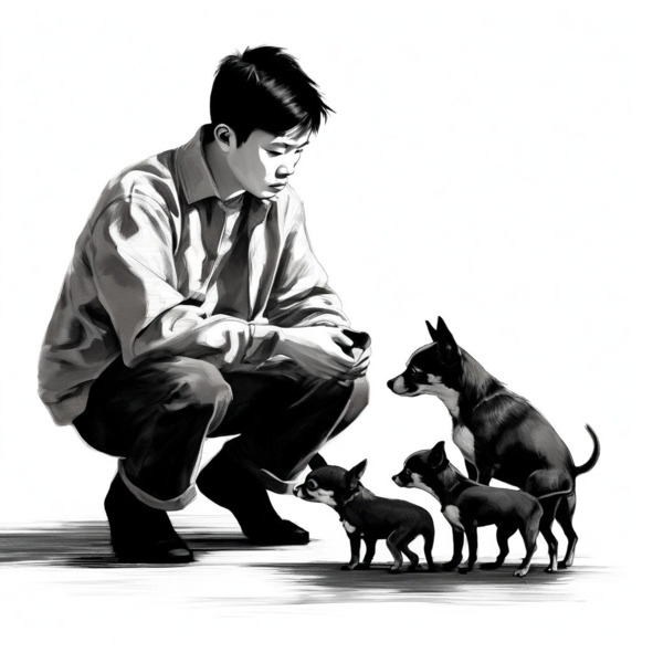 Когда автобус медленно подъехал к станции, я потащил своё усталое тело домой. Дома меня ждали четыре чихуахуа. Я присел на корточки и посмотрел на своих трёх маленьких чихуахуа и их маму, а моя мама медленно шла позади меня.