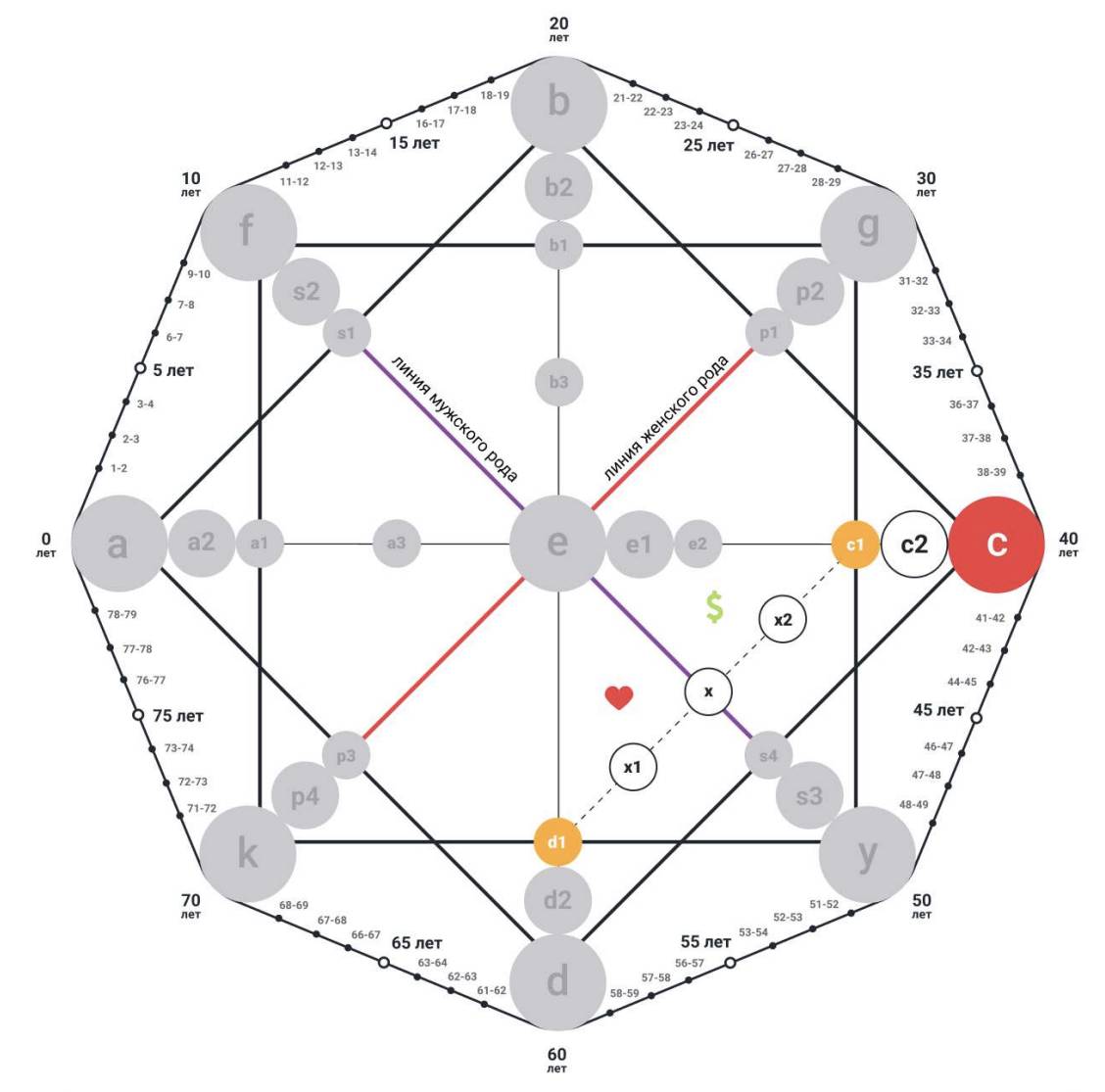 Нам пригодится несколько разных точек. Ниже приведена картинка, как в целом выглядит наша Матрица жизни. За таланты от Бога отвечают точки b,b2 и b1.