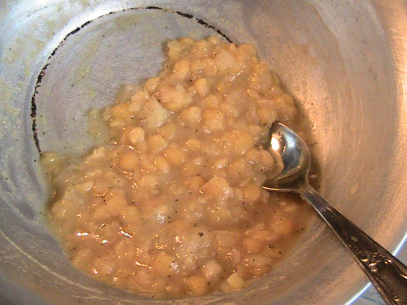 «Рецепт „горохового пюре“. Слить в тарелку почти весь оставшийся в к горохе отвар. Берём погружной блендер и измельчаем. Добавляем слитый из тарелки отвар: до желаемой густоты, по – вкусу! В тарелку с пюре можно по мере остывания, или разбавления густоты пюре, добавлять гороховый отвар из другой тарелки, поливая отваром пюре сверху. Затем можно есть пюре, перемешивая его с отваром или нет».