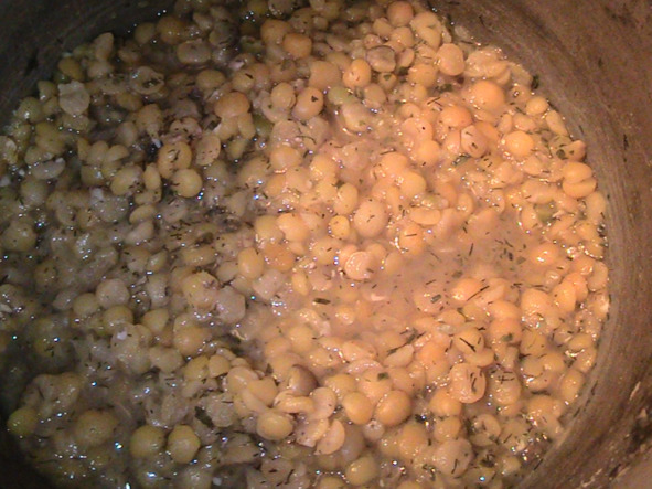 «Горох „суповой ароматный“. Если репчатый резаный полукольцами лук тоже: закинь и накрыв крышкой дай постоять 5 минут одновременно с приправами. Можно накладывать и есть!»