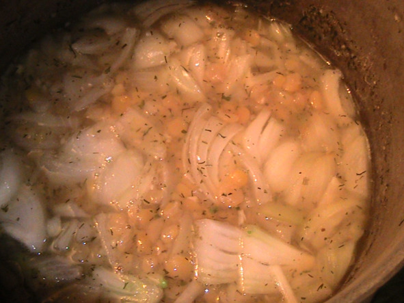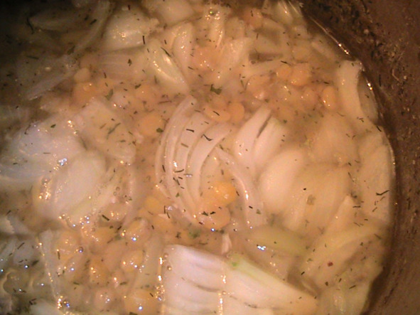Берём алюминиевую кастрюльку на 2,5 литра. Налить в кастрюльку 3,5 стакана воды. Ставим на огонь до закипания. Берём 1,5 стакана обычного колотого жёлтого гороха (половинками). Промыть в трёх водах. В горячую воду в кастрюльке бросить половину (с горкой) столовой ложки крупной соли. Плюс в кастрюльку ещё сыпем 2 чайные ложки сахара (можно как получится: ложки с горкой). В кипящую воду бросить промытый горох, снять пену. И на самом малом огне под закрытой крышкой варим 40 – 50 минут. За это время очистить и мелко порезать крупную головку репчатого лука. Горох разварился? вода-почти выкипела? Получиться должен такой густоватый суп. Теперь: