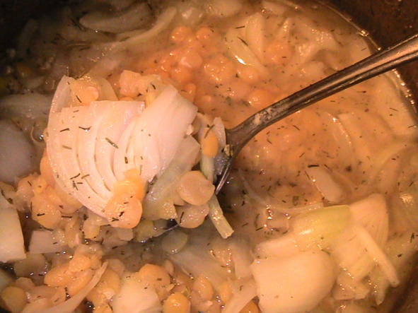 Для «супового гороха -2» ВАРИМ БЕЗ САХАРА! Режем репчатый лук полукольцами (разнообразие и польза) Через 30 минут варки под крышкой на самом малом огне бросить один среднего размера промытый предварительно холодной водой под краном лавровый лист. Как горох полностью сварился – всыпать свежую зелень: укроп. Если ещё и с репчатым луком —всыпать резаный полукольцами лук, кастрюльку плотно закрыть крышкой и дать постоять минимум 5 минут. Потом есть.