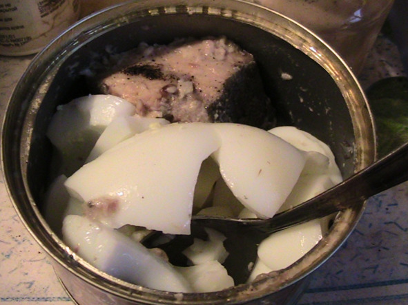 Но..БЕЗ МАЙОНЕЗА? Так нам нужен..ТОЛЬКО ВКУС! вот: не плохо подменит… Консервированная горбуша или сайра! Просто-РАЗДЕЛЬНО белки и рыба в банке — употребляемая одновременно!