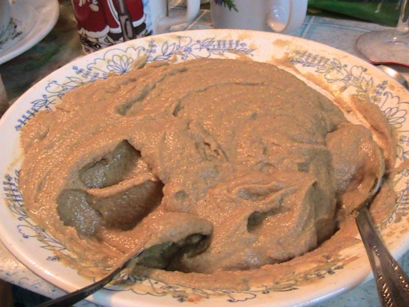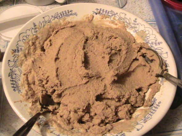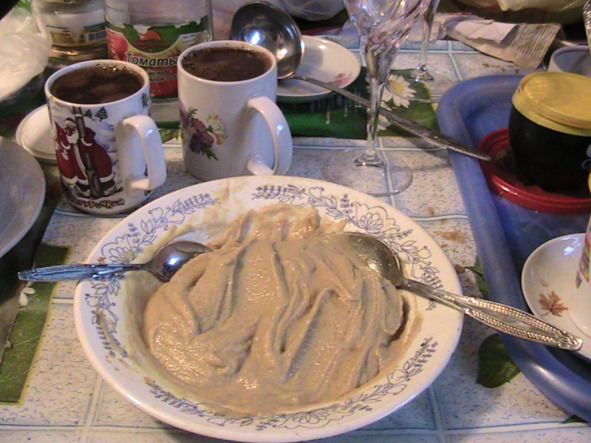 «В тарелке насыпано 8 столовых ложек с горкой (как получится!) – горчичного порошка. Чуть, понемножку, наливаем маленькое количество воды в середину тарелки: ТЩАТЕЛЬНО ПЕРЕМЕШИВАЯ чайной ложкой, помогая столовой. Соскребая прилипающий намокший горчичный порошок чайной ложкой -со столовой ложки. Потом столовой – соскребать с чайной: такая вот «взаимовыручка»! Размешиваем, доливаем: ДО СОСТОЯНИЯ «ГУСТОГО ТЕСТА»!