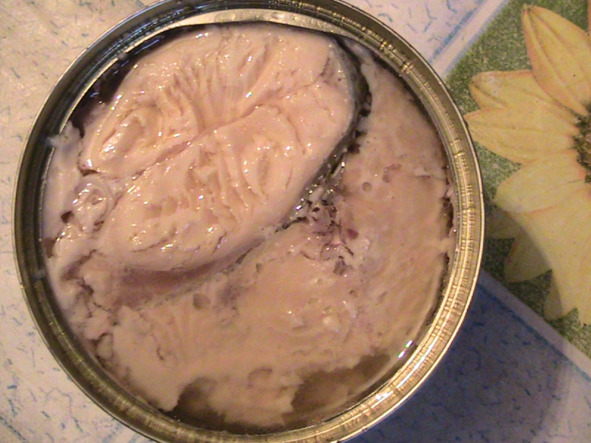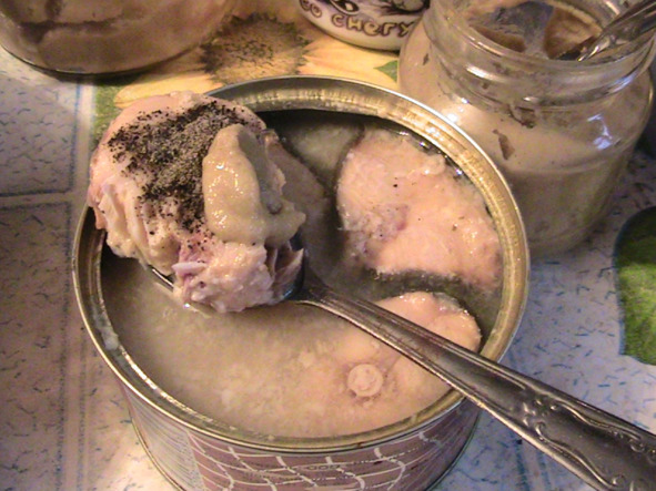 ЕСТЬ– с консервированной разламывая или целиком «окуная» в банку с рыбой: заливка рыбы солёная! Или в заливку в банку консервированного горошка.