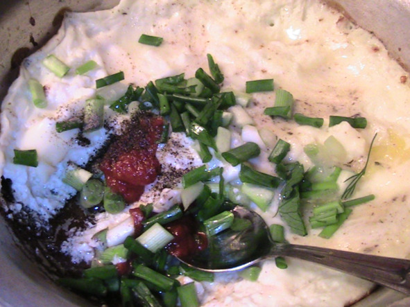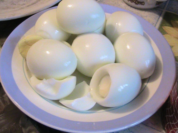 «„Здоровый обед-1“: источник белка – в „день занятий“: КОРМИ МЫШЦУ-БЕЛКОМ „заченрпывая“ ложкой белки и рыбу-ОДНОВРЕМЕННО! Самое то, что надо -после физических занятий! Кстати! „черпая“ белки ВМЕСТЕ С измельчёнными кусочками рыбы-вот тебе и ВКУС „салата в половинке яйца“. И в котором ТАМ..присутствует майонез!»