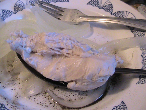«Куриное филе с луком, который бросается ТОЛЬКО после готовности филе: бросить в бульон, плотно накрыть крышкой, выключить огонь и дать постоять с луком 5 минут. ГОТОВО! Достаём филе и порционо лук: докладывая по необходимости. Лук съесть весь: иначе он размякнет и будет „бесполезным“ по содержанию полезных витаминов!»