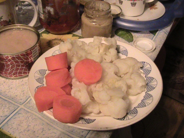 «Здоровый обед – 3» – в «день отдыха» или «неактивный день»: «МИНУСОВЫЕ» продукты. Как приготовить: В алюминиевое блюдо на 2/3 налить холодной сырой воды из-под крана и поставить на большой огонь. Воду НЕ СОЛИТЬ! Почистить морковь: соскребательными движениями от задней части-к носику. Держа морковь в левой руке, правой – тонко соскребаем острым ножиком верхний грязный слой морковки. Очищенную морковку промыть под струёй тёплой воды и потом-ополоснуть холодной. Нарезать на НЕБОЛЬШИЕ кусочки: чтобы быстрее сварилась! Цветную ещё «в букете», как она растёт, промыть под тёплой водой -с ХОЗЯЙСТВЕННЫМ МЫЛОМ: неизвестно КАКИЕ РУКИ её трогали! Ополоснуть холодной водой. Разобрать на соцветия. Ополоснуть под холодной водой пару маленьких или один среднего размера лавровый лист и бросить в блюдо с водой, стоящее на огне. Сразу бросаем теперь кусочки моркови и соцветия цветной капусты. Доводим до кипения и кипятим ЦВЕТНУЮ КАПУСТУ- примерно 3 минуты НЕ БОЛЬШЕ! Сохраняем витамины!