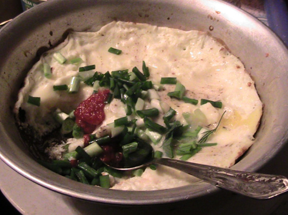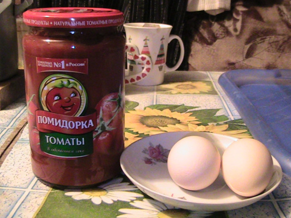 «Здоровый обед -5»: полезная «подпитка» мышцам- в «день занятий»! «БЕЛКОВОУДЕРЖИВАЮЩИЕ продукты» – «яичница-1» с томатной пастой и консервированная сайра. Витамины – свежая зелень.»