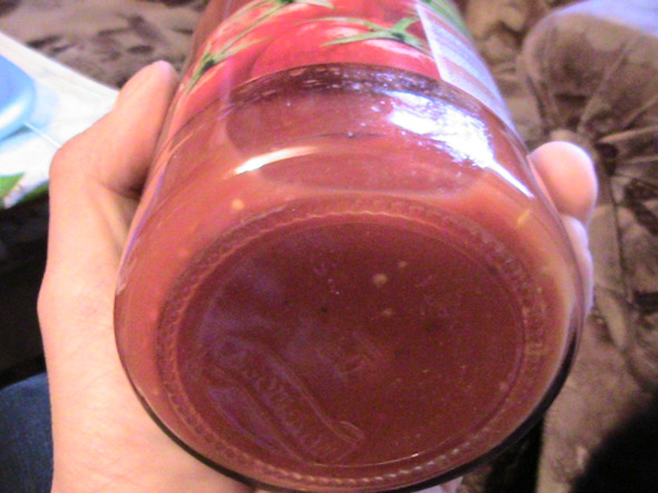 Вот как видны эти «помидорные вкрапления» семечек помидор: для этого ПРОСТО ХОРОШО ПОКРУТИ саму банку ТОМАТОВ: должны БЫТЬ ВИДНЫ жёлтые семечки помидор -СКВОЗЬ СТЕКЛО БАНКИ! Отчётливо семечки помидор НАСТОЯЩЕГО томатного сока -ОТЛИЧНО ВИДНЫ сквозь стекло банки: ОСОБЕННО ОТЧЁТЛИВЫ ЖЁЛТЫЕ семечки помидор -на ДНЕ БАНКИ: ПЕРЕВЕРНИ БАНКУ НА БОК и ВНИМАТЕЛЬНО ПОСМОТРИ.