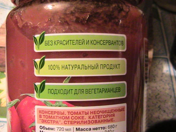«Чтобы определить, НАСТОЯЩИМ соком из самих помидор залиты томаты, нужно РАЗГЛЯДЕТЬ „помидорные вкрапления“: ХОРОШО ПОКРУТИ САМУ БАНКУ с томатами! Вот как видны эти „помидорные вкрапления“ семечек помидор: для этого ПРОСТО ХОРОШО ПОКРУТИ саму банку ТОМАТОВ: должны БЫТЬ ВИДНЫ жёлтые семечки помидор -СКВОЗЬ СТЕКЛО БАНКИ!»
