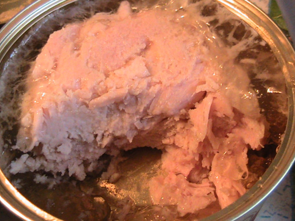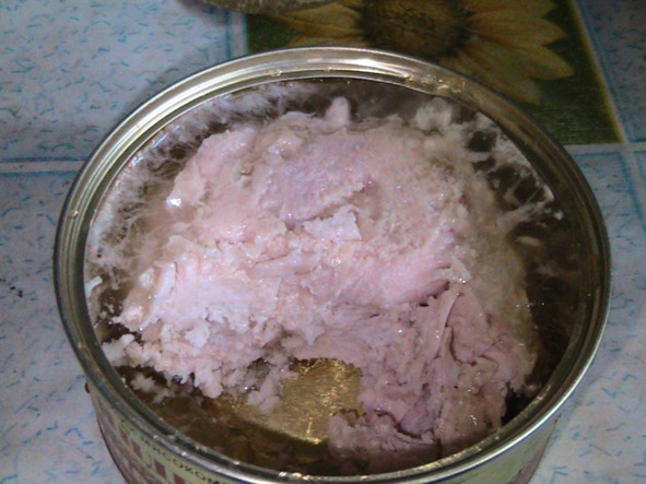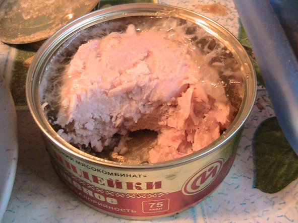 «В кастрюлю с уже промытой лапшой бросил на лапшу „диетическую тушёнку“, размял сплошной кусок мяса на кусочки помельче, выкладывая из банки и желе»!